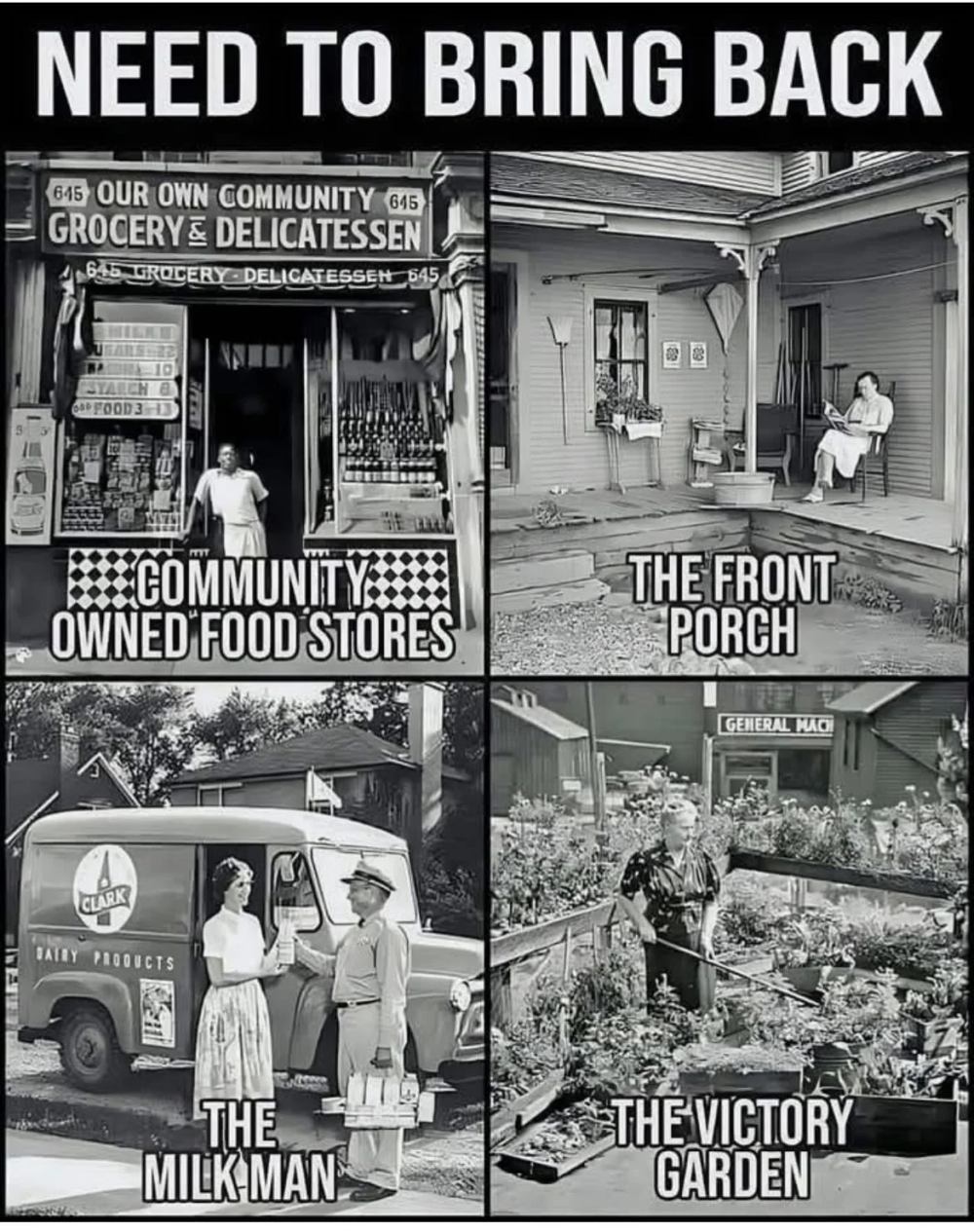 In an era dominated by screens, fast deliveries, and endless online connections, many people find themselves yearning for something simpler — something more real. The photo above captures that longing perfectly, reminding us of the things our grandparents once had that we’ve slowly lost: community-owned food stores, front porches, milkmen, and victory gardens.